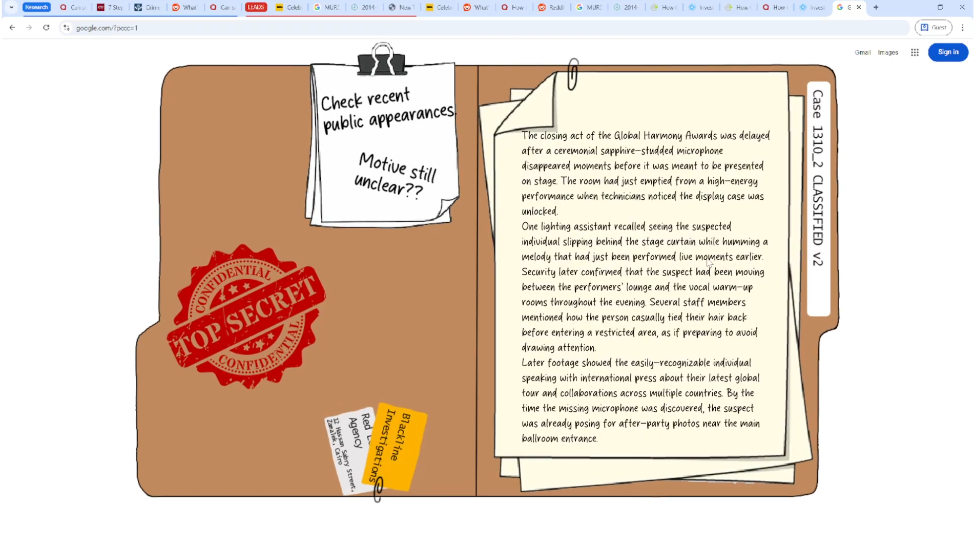 Each case begins with a witness report describing a strange incident during a high-profile event. The description won’t directly tell you who the suspect is — you’ll need to pick up on subtle clues about their identity.